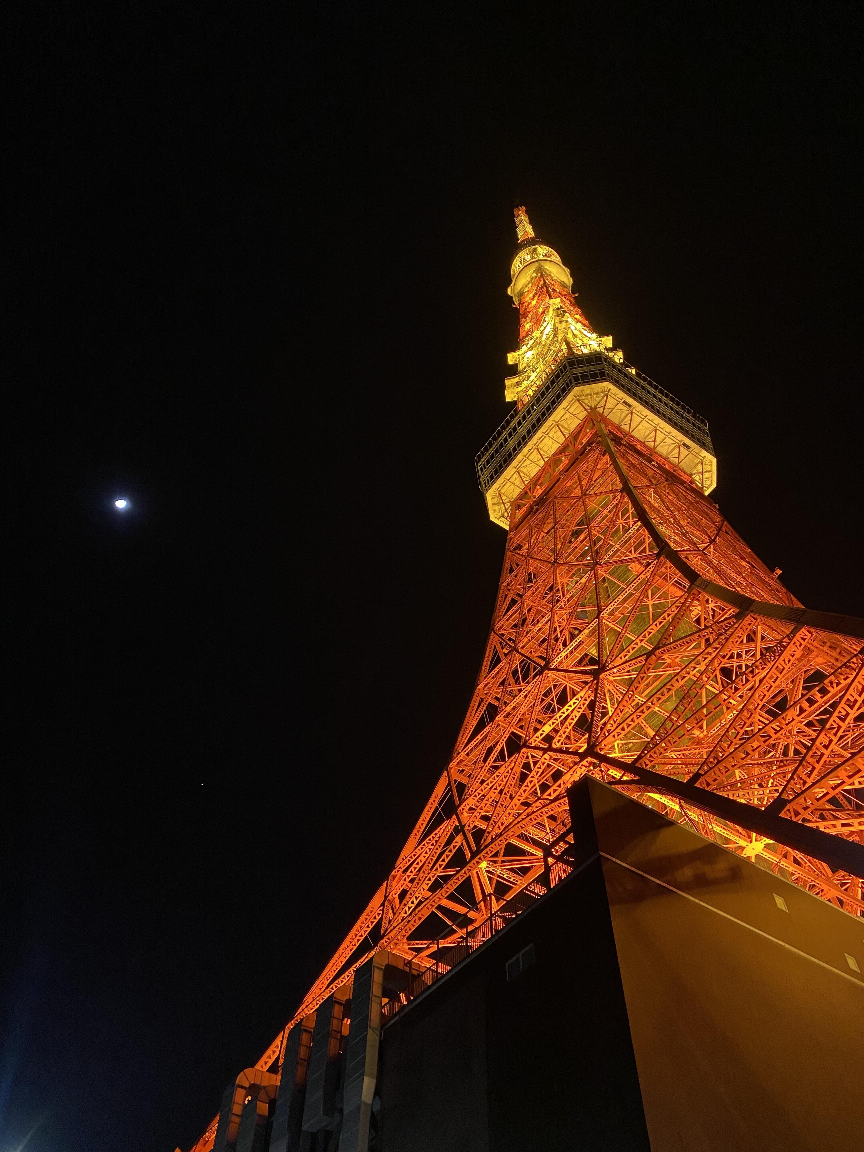 夜になり、ライトアップされた東京タワーは記憶よりも鮮やかできらきらとしていて、調べてみると東京タワーは夏季と冬季でライトアップの際の色味を変えているそうです。夏季は白めのライト、冬季は温かみのあるライトになっているそうです。